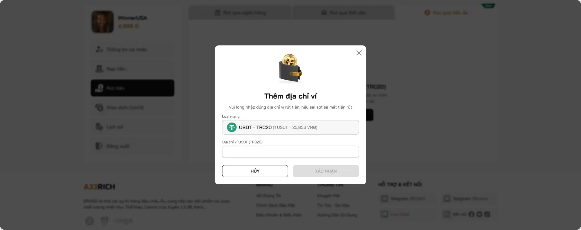 Bấm vào nút thêm địa chỉ ví và nhập chính xác địa chỉ ví USDT(TRC20) của Quý khách.