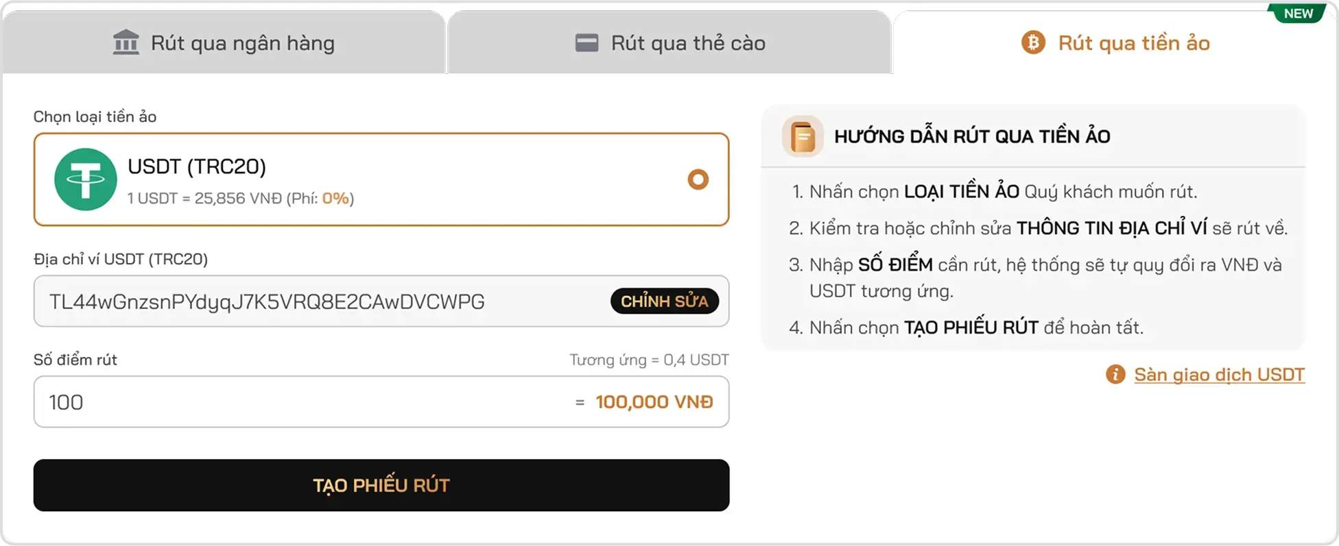 - Khi nhập số điểm cần rút, hệ thống sẽ tự quy đổi ra VNĐ cũng như số USDT mà Quý khách sẽ nhận được.