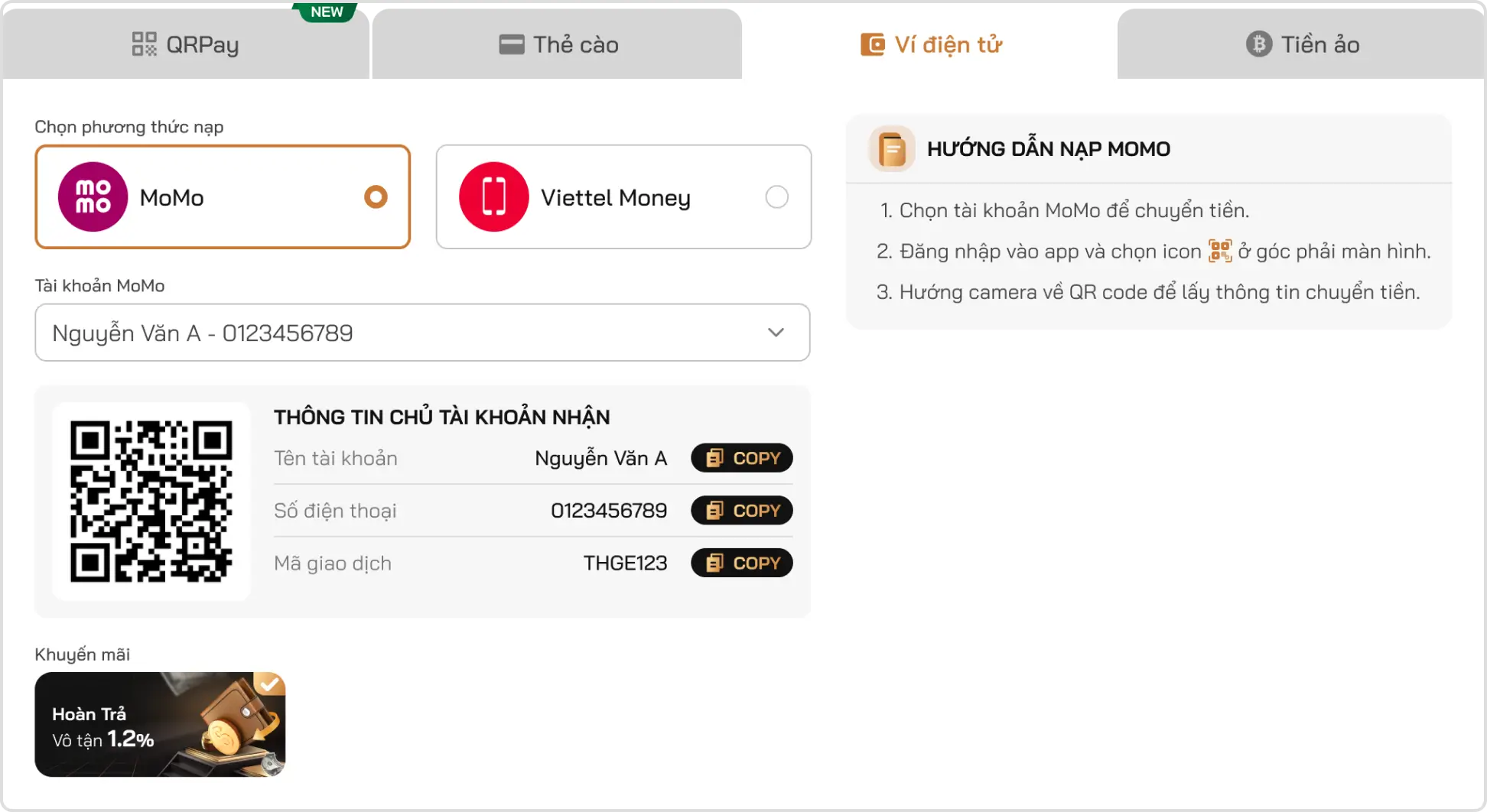 - Nạp qua MOMO/VIETTEL MONEY chỉ áp dụng Khuyến mãi HOÀN TRẢ 1.2%.