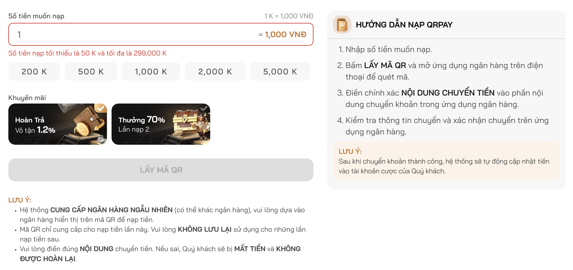 - Hệ thống cung cấp ngân hàng ngẫu nhiên (có thể khác nhân hàng), vui lòng dựa vào ngân hàng hiển thị trên mã QR để nạp tiền.