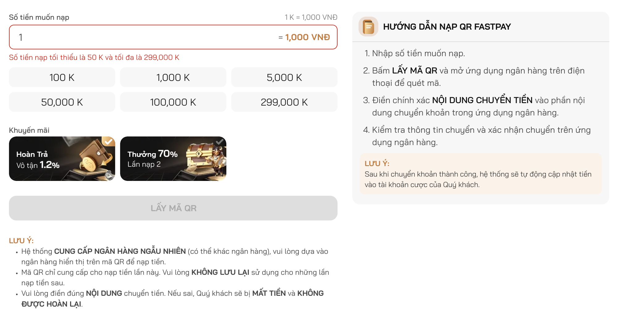 • Hệ thống cung cấp ngân hàng ngẫu nhiên (có thể khác nhân hàng), vui lòng dựa vào ngân hàng hiển thị trên mã QR để nạp tiền.